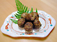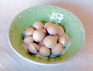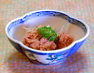 出し巻き玉子 玉子料理という物は煮る・焼く・蒸す・揚げる・漬けると言ったさまざまな料理方法がありますが、極めると非常に難しい食材です。某有名料亭でも現にゆで卵がその店の定番であったりもします。この出し巻き玉子もいつも焼く時には気持ちを込めて焼かないとうまく焼けません。例えばその日の天候なども大きく影響されたりします。きれいに焼き上がった時は嬉しいですよ。 |
