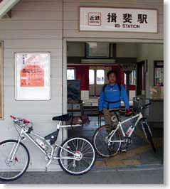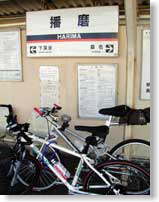 そして、とりあえずの第一目標近鉄播磨駅にはAM8:00頃に無事に到着する事が出来ました。サイクルトレインがやってくるのはAM8:47ですからたっぷりと時間はあります。この駅までの走行距離は14qとスピードメーターは知らせてくれました。無人駅でホームも小さな駅です。ここでデジカメに自転車二台と播磨駅の看板を入れてシャッターを切りました。自宅に帰って当店のホームページに公開する為に必要な写真です。