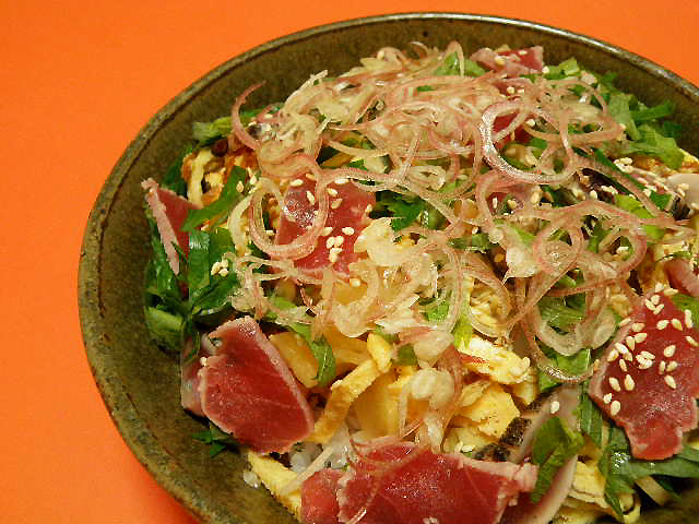 このちらしはいわゆるメニューにない裏メニューです私たちが仕事を終えた時にたまに造って食べるまかないご飯、これを商品化した物がこのちらし寿司です。色々なネタが使ってありますので味のバリエーションが楽しめてボリューム感もあります。とても人気なちらし寿司です。 1人前=1.100円(税込み)より調理致します |